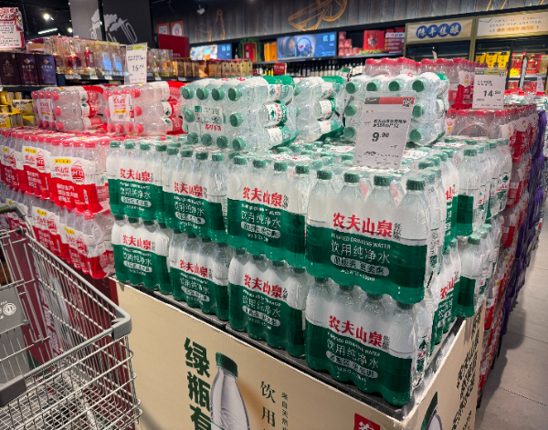近日,记者在北京朝阳区、顺义区走访了四家超市,包含知名的永辉超市和华联超市。走访发现,价格优惠和品牌优势是消费者选购的关键因素。绿色瓶装农夫山泉纯净水在超市里摆放的位置都较为显眼,价签上写着:12瓶550毫升9.9元。农夫山泉天然水12瓶550毫升15.9元;冰露纯悦包装饮用水12瓶550毫升14.9元;娃哈哈纯净水12瓶596毫升14.9元。