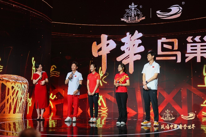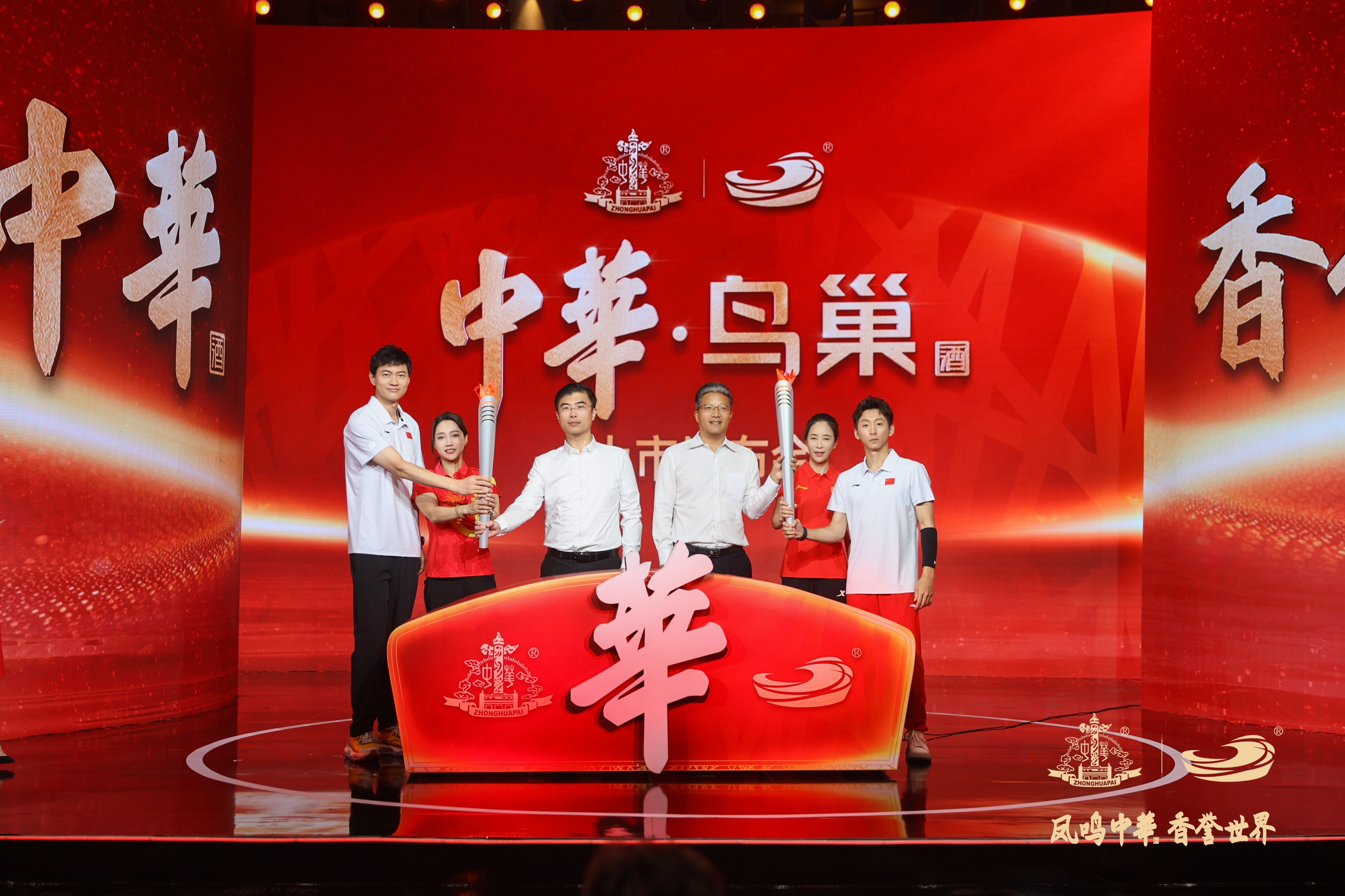 在王丽萍、仲满、毕文静、林跃四位体育冠军和郭志国、韩松共同高举荣誉火炬,点亮璀璨“华”光,共同揭开中华·鸟巢酒的神秘面纱,见证荣耀时刻。
