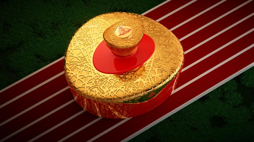 具有体育激情的中国红与金色搭配,彰显了东方的荣耀与优雅,激发着体育运动的无限热情。瓶身镌刻了8组代表性运动图标,礼盒两侧烫印了夏季35组运动图标与冬季28组运动图标,每一个图标都为颂扬与传承大国体育精神。红山玉龙纹样代表着民族团结一心,勇往直前的风貌,与现代体育精神遥相呼应。远看中华鸟巢酒宛若一艘宝船,蕴含着福运财运满载而归的美好期盼。