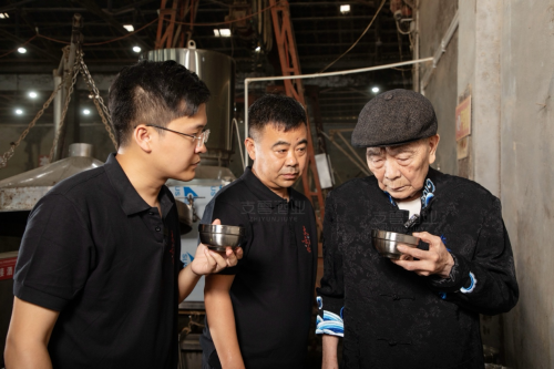 张支云与家族传承人在支云酒庄品鉴基酒品质(左起:支云酒业董事长张炀、总工程师张富强、灵魂创始人张支云)