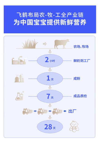 依托全产业链优势,飞鹤打造了“2小时生态圈”,将智能工厂建在自有牧场周边,通过全自动化设备采集鲜奶,将鲜奶在十分钟内降低至4℃,每一滴新鲜生牛乳从挤奶到加工成粉全程不超过2小时。同时,飞鹤联合第三方创新模式,实现产品从牧场到餐桌“28天新鲜直达”,最大化保留了鲜奶关键活性营养,给宝宝极致新鲜,更充分的营养。