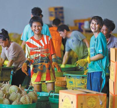 在优果东明水果厂,当地工人对榴莲进行清洁处理。记者 白元琪摄