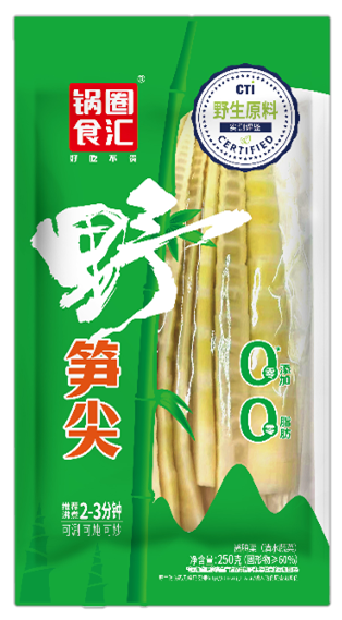 另一款非常典型的产品是锅圈的高山野生笋。这款产品的原产地是四川凉山以及云南等偏远山区,当地自然条件优越,远离污染,是优质野生笋的天然产区。过去这款产品仅在包装上呈现了“高山箭竹”、“火锅笋片”等笼统的产品名,无法充分呈现产品的品质。