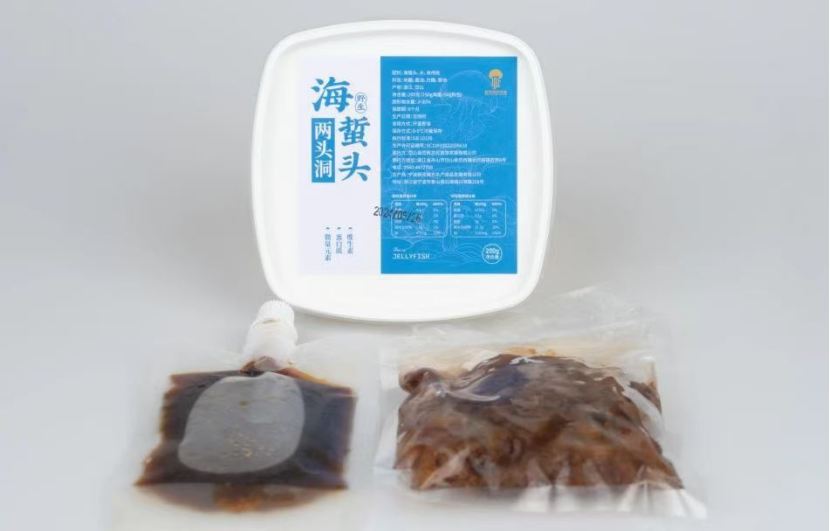“两头洞海蜇虽然美味,但食用方法比较复杂,今年,我们岱西推出了这款即食海蜇,拆开包装搅拌一下就可以吃了,还可以加入黄瓜丝、莴笋丝……”镜头面前,赵焕元手中的“两头洞”野生海蜇一改往日简易土气的包装,换上了以蓝+白为主色调的礼盒,干净大气;封面是国风水墨手绘海蜇和海浪的插画,灵动又可爱;礼盒打开后便是小巧而又精致的海蜇和料包。