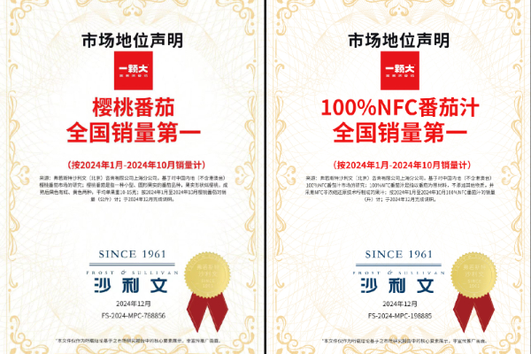 近日,全球增长咨询公司弗若斯特沙利文(Frost &Sullivan,下简称:沙利文)发布权威调研报告,经过严谨的市场调研及海量数据分析,认定高端水果番茄品牌一颗大™“樱桃番茄全国销量第一、100%NFC番茄汁全国销量第一”的市场地位。