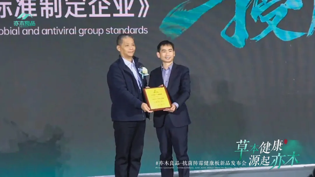 众望所期下,会议正式进入抗菌抗病毒团体标准制定企业的授牌仪式,亦木良品新材料研究院院长马兆兴代表亦木良品上台,中国林产工业协会标准化技术委员会秘书长「翟东群」正式宣布亦木良品当选《抗菌抗病毒饰面人造板》标准制定单位并颁发牌匾。