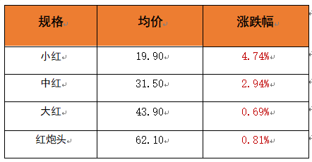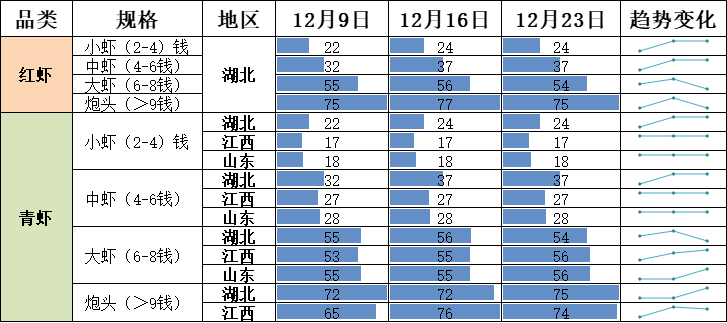 截至12月23日,红虾均价报39.35元/斤,环比上涨1.68%。其中,小红均价报19.90元/斤,环比上涨4.74%;中红均价报31.50元/斤,环比上涨2.94%;大红均价报43.90元/斤,环比上涨0.69%;红炮头均价报62.10元/斤,环比上涨0.81%。