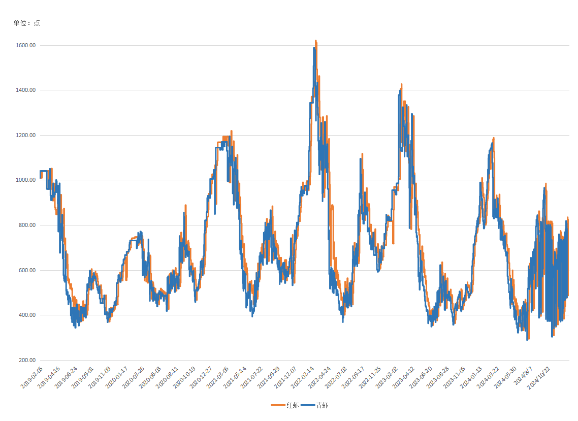 图2 红虾和青虾价格指数走势对比(单位:点)