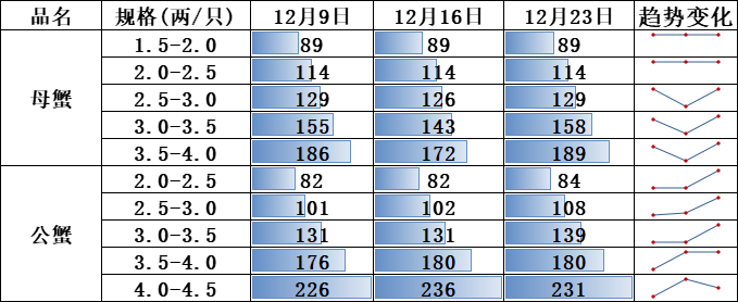 近期大闸蟹上市量继续缩减,价格波动不大,预计大规格螃蟹价格将进一步上涨。螃蟹产地交易方面,本期各规格价格涨跌互现,其中母蟹价格小幅上涨,公蟹价格涨跌互现。截至2024年12月24日,各规格母蟹价格中3.0-3.5规格报158元/公斤,环比增幅较大,为10.49%;各规格公蟹价格中4.0-4.5规格报231元/公斤,环比小幅下跌,为2.12%。