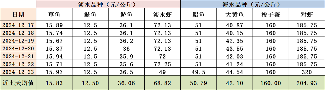 本期全国主要淡水水产价格和海水水产价格均涨跌互现。农业农村部信息中心监测数据显示,截至12月24日,全国水产销地批发草鱼价格7日均线为15.83元/公斤,周环比上涨0.44%;鲢鱼价格7日均线为12.50元/公斤,周环比持平;鲈鱼价格7日均线为36.06元/公斤,周环比下跌0.30%;淡水虾价格7日均线为68.82元/公斤,周环比下跌4.03%。海水品种方面,全国水产销地批发鲳鱼价格7日均线为50.79元/公斤,周环比下跌0.42%;大黄鱼价格7日均线为42.10元/公斤,周环比下跌0.11%;梭子蟹价格7日均线为160.00元/公斤,周环比上涨3.07%;对虾价格7日均线为204.93元/公斤,周环比上涨10.32%。