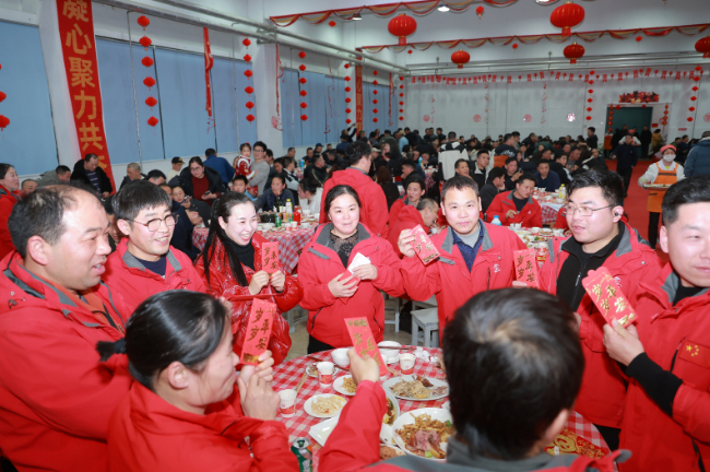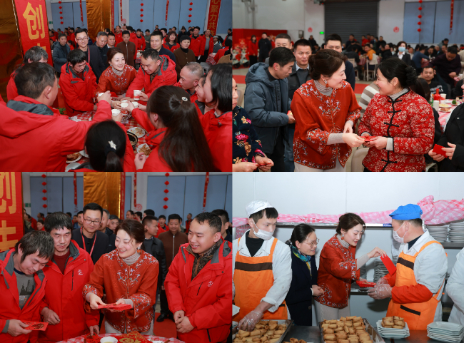 随后,宗馥莉走到桌前一一敬酒,并为现场每位青工派发500元过年红包。这是娃哈哈请留杭青工吃年夜饭的第38个年头。年夜饭年年请,红包年年发。总经理团拜会上发红包这一传统也被延续下来,成为企业与员工同心共赢的温情符号。