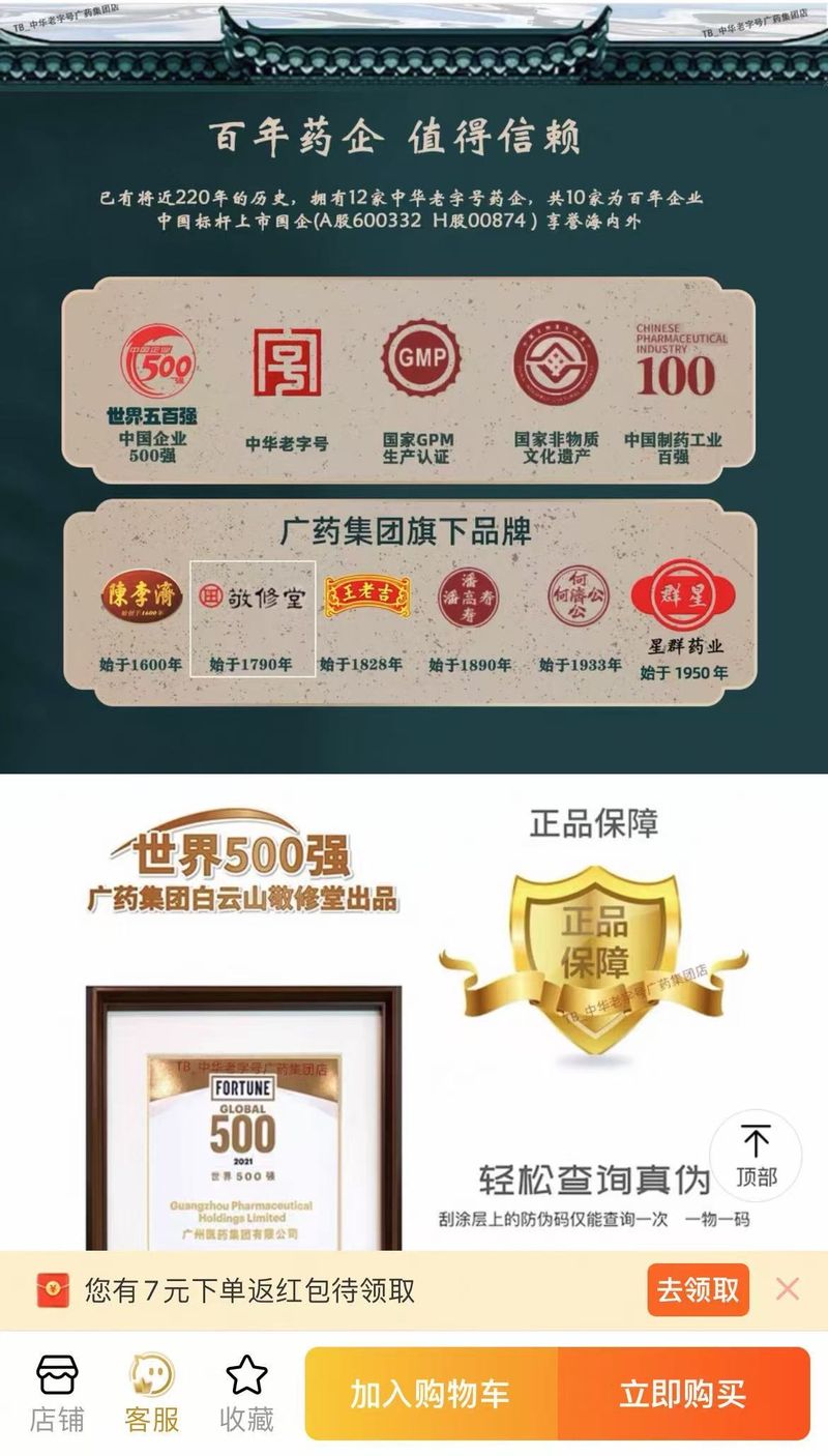 记者还发现,在售卖相关产品时,背后的知名药企也是商家宣传的一大“卖点”。上述三款鸡内金相关产品的外包装商标,均明显标示有白云山、哈药集团、仁和的品牌标识。其中,中华老字号广药集团店更是将广药集团作为一大“卖点”专门介绍,提及“已有将近220年的历史,拥有12家中华老字号药企业,共10家为百年企业”,以此来增加产品的可信度。