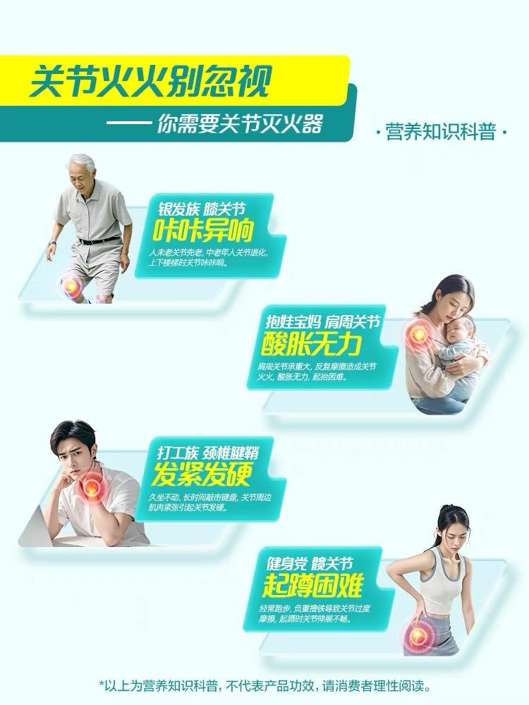 在某网购平台另一家品牌旗舰店,其在售的氨糖软骨素产品属于保健食品,其保健功能明确显示:本品经动物实验评价,具有有助于改善骨密度的保健功能。而在其介绍页面却有“关节火火别忽视——你需要关节灭火器,银发族膝关节咔咔异响,抱娃宝妈肩周关节酸胀无力,打工族颈椎腱鞘发紧发硬,健身党髋关节起蹲困难”相关表述,不过,为了规避相关风险,商家在下方用缩小的字号标出“以上为营养科普知识,不代表产品功效,请消费者理性阅读”。