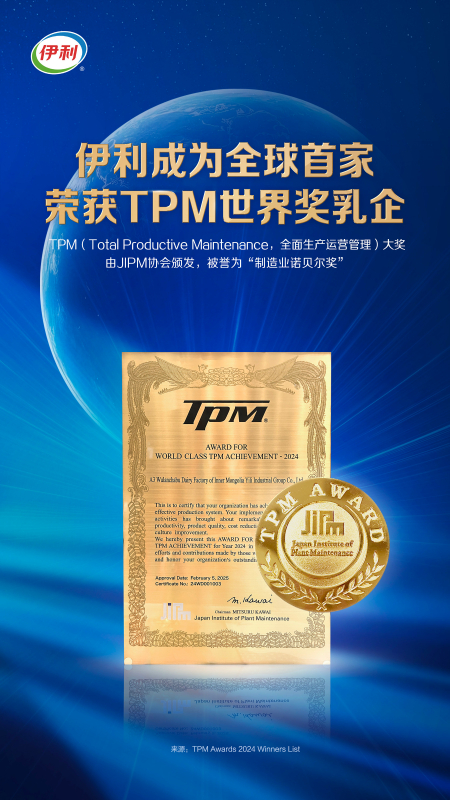 TPM系列奖项由全球最权威的TPM实施评估机构——JIPM(日本设备维护协会)设立,被誉为“制造业诺贝尔奖”,是全球制造业“更快、更高、更强、更团结”的标杆。此次,伊利旗下多家工厂通过严苛评审、脱颖而出。除了乌兰察布工厂荣获最高级别的TPM“世界奖”之外,合肥伊利、金川三车间、天津伊利荣获TPM“特别奖”,黄冈伊利、定州伊利、大阳牧场荣获TPM“持续优秀奖”。截至目前,伊利有近40家工厂获得JIPM-TPM系列奖项,超过国内其他乳企获得该奖项工厂的数量总和。