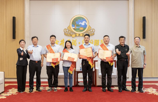 古井集团为英勇救火的“古井好人”吴涛(右四)和刘黎明(右三)送荣誉