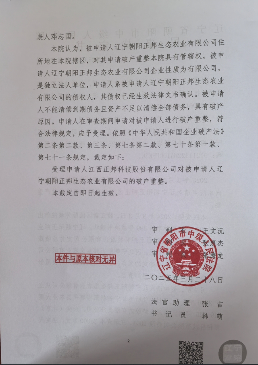3月28日,辽宁朝阳市中级人民法院依据《中国人民共和国企业破产法》,发出《辽宁省朝阳市中级人民法院民事裁定书》((2025)辽13破申1号),裁定受理辽宁朝阳正邦生态农业有限公司(以下简称“朝阳正邦”)的破产重整申请,标志着该公司正式启动破产重整程序。