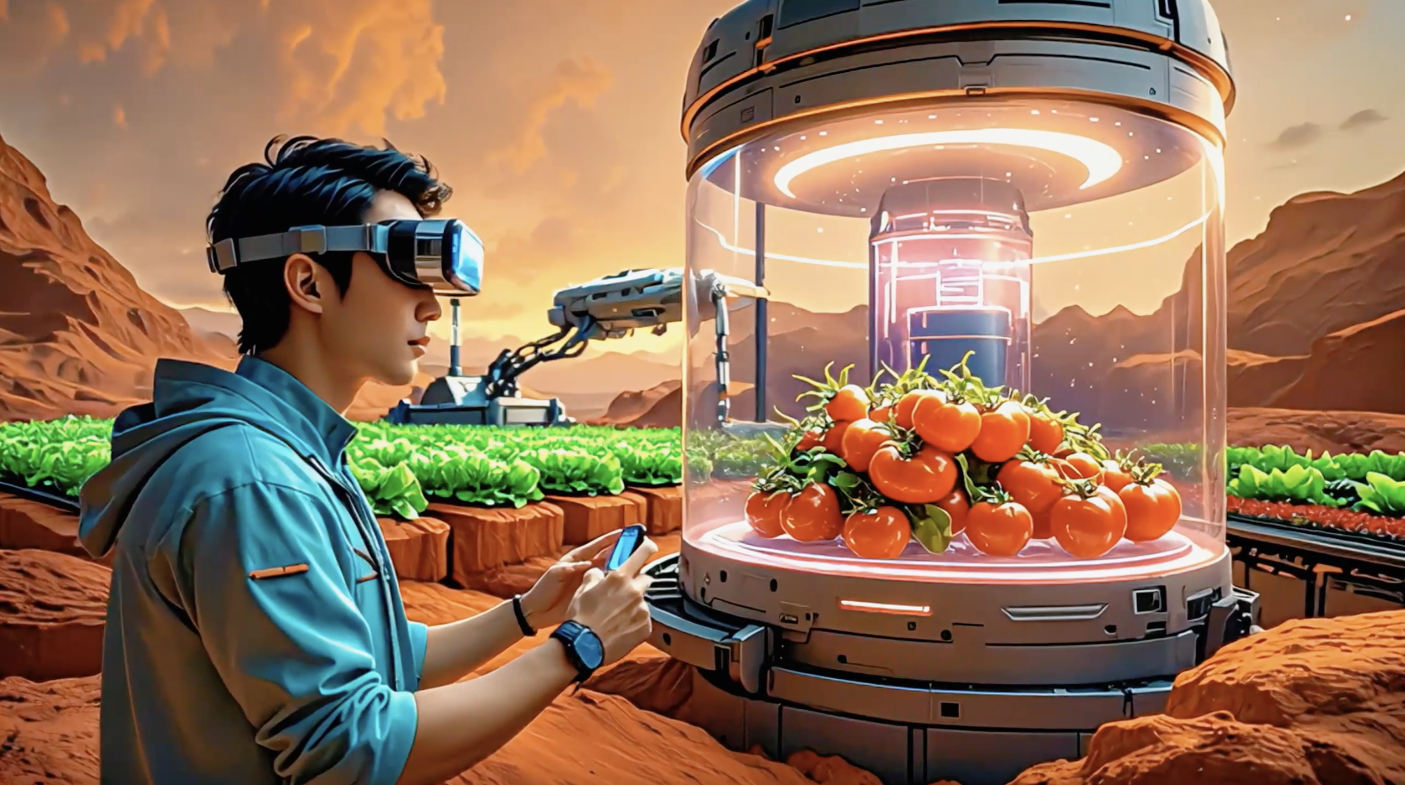 戴上VR眼镜,王怡辰用手指在虚空中轻轻一点,一颗番茄种子瞬间破土,藤蔓沿着火星基地的穹顶攀爬,转眼结出鲜红的果实。