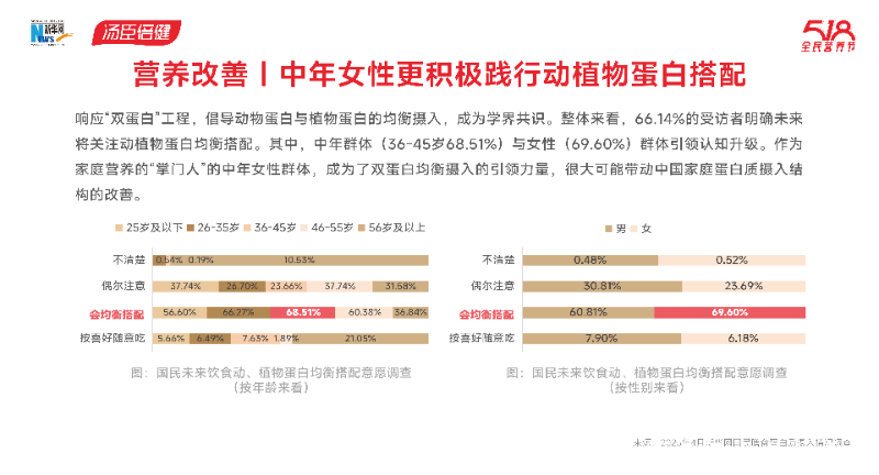 那么,普通人应当如何吃对优质蛋白?动植物蛋白科学搭配的饮食方式值得大力推广。《报告》显示,超六成的受访者表示未来将更加注重动植物蛋白的搭配摄入。特别是作为家庭营养“掌门人”的中年女性,她们对于这一科学理念的认同,有望成为改善中国家庭蛋白质摄入结构的关键力量。