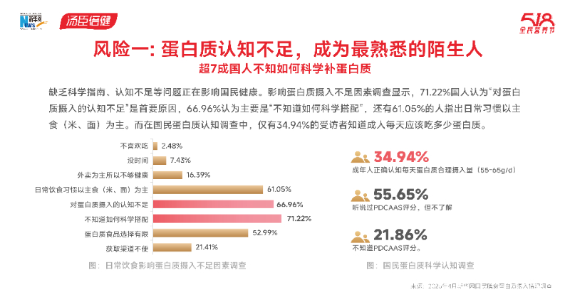 通过问卷调查、走访等形式,《报告》敏锐捕捉到大众的需求和困惑。随后,518全民营养节提出“每天一杯优质蛋白,为健康打底”的科学营养倡议,并联合权威专家针对性打造了系列实用科普,帮助更多人轻松吃对优质蛋白。