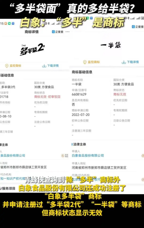 据青蜂侠消息,除“多半”商标外,白象食品股份有限公司还成功注册了“白象多半袋”商标,并申请注册过“多半袋2代”“一半袋”等商标,但商标状态显示无效。