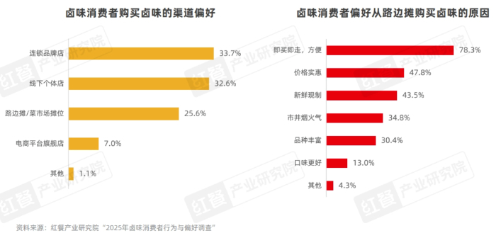 红餐产业研究院“2025年卤味消费者行为与偏好调查”显示,有33.7%的消费者偏好选择在连锁品牌店购买卤味,看中的是连锁品牌店的信誉可靠、口味稳定、卫生较有保障等优势。此外,消费者偏好在个体店购买卤味的比例与连锁品牌店的比例相近,这表明线下个体店的竞争力不容小觑。此外,路边摊/菜市场摊位的购买渠道也受到较多消费者的青睐。