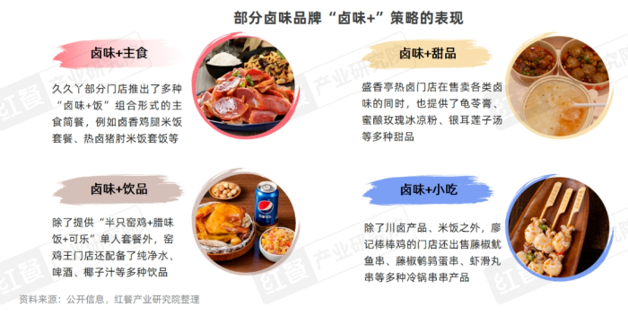 例如,煌上煌、久久丫等休闲卤味品牌开始将卤味与主食结合,拓展午餐、晚餐等场景,探索快餐化;盛香亭热卤推出了甜品类产品,来适配下午茶场景;在川卤产品之外,廖记棒棒鸡还在门店售卖冷锅串串产品。