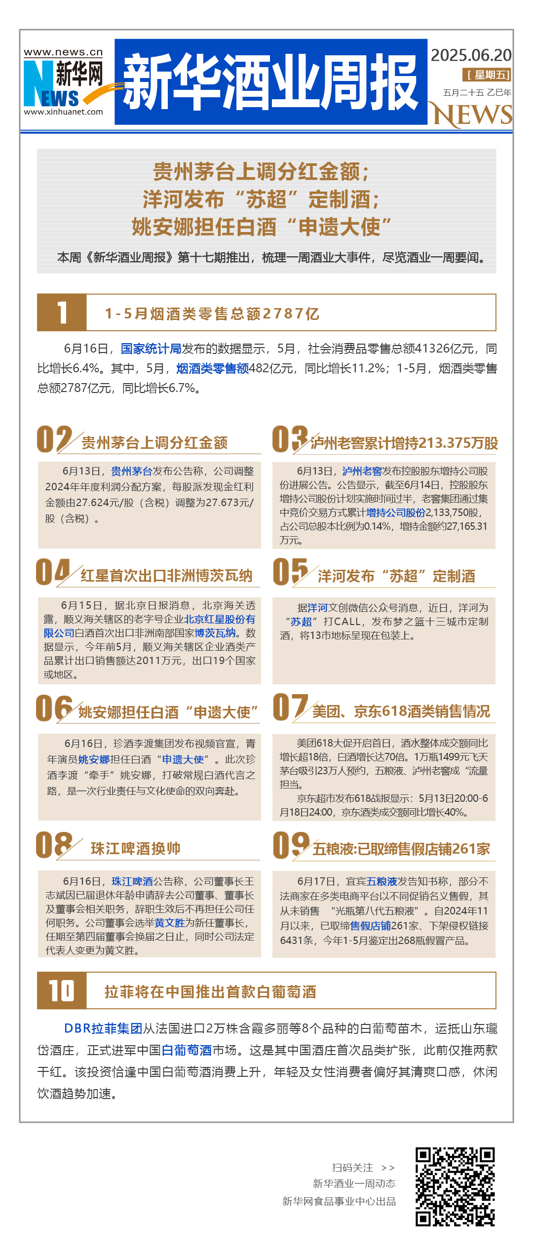 本周(6月14日-6月20日)国家统计局发布的数据显示,1-5月,烟酒类零售总额2787亿元,同比增长6.7%。企业方面,贵州茅台上调分红金额,每股派发现金红利金额由27.624元/股(含税)调整为27.673元/股(含税)。近日,洋河为“苏超”打CALL,发布梦之篮十三城市定制酒,将13市地标呈现在包装上。珍酒李渡集团官宣,青年演员姚安娜担任白酒“申遗大使”,开启白酒申遗新征程。