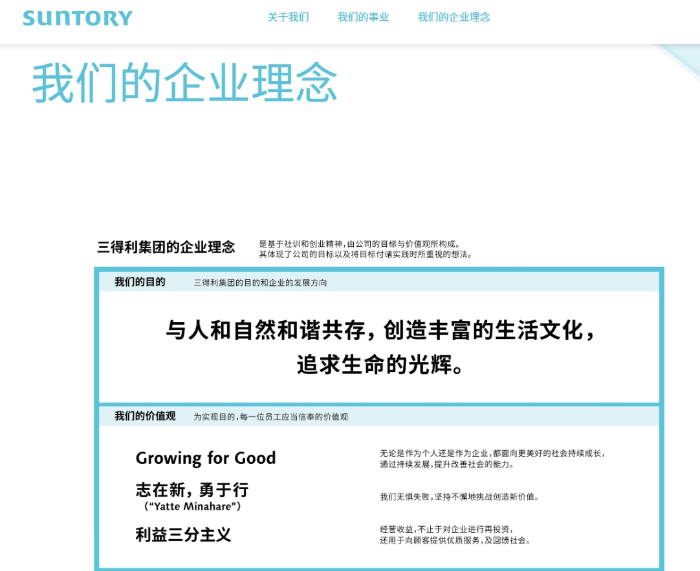 打开三得利中国官网,"与人和自然和谐共存,创造丰富的生活文化,追求生命的光辉"的企业理念格外醒目。