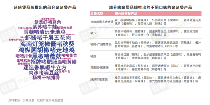 从口味上看,部分品牌在传统的咸甜、酱香口味以外,还尝试将辣味、酸味等风味融入啫啫煲产品中。在广东以外的部分啫啫煲品牌,会根据当地饮食口味对啫啫煲产品进行改良。例如,名四娘鲜辣啫啫煲将啫啫煲的做法与川菜的麻辣特色结合,推出了火辣辣啫鲜鱿、香辣啫鸡翅、鲜椒啫五花肉等川式口味的啫啫煲产品。