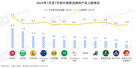 近年来,餐饮市场的竞争日趋白热化,为了在市场中站稳脚跟,众多品牌纷纷加快了产品创新步伐,西餐品牌亦是如此。据红餐产业研究院不完全统计,2025年1月至7月,必胜客累计推出了60余款新品,平均每月新品数量达到8.7款;萨莉亚、卢家妈妈、bluefrog蓝蛙、卡朋西餐等品牌的月均新品数量也均超过了5款。
