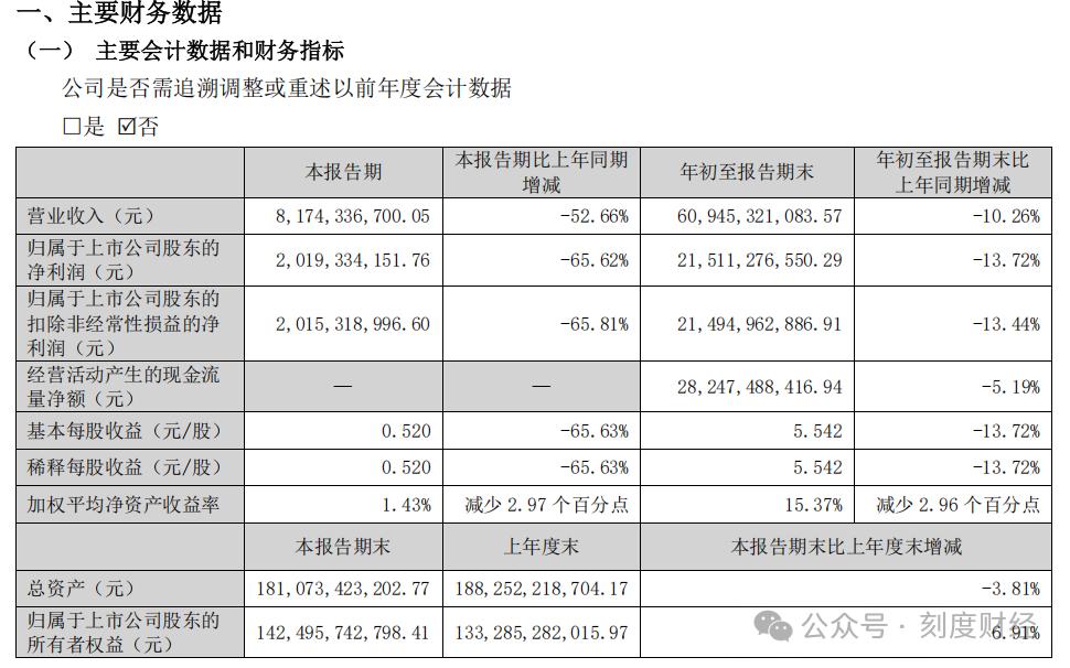 五粮液前三季度营业收入609.45亿元,同比下滑10.26%;归母净利润215.11亿元,同比下滑13.72%。