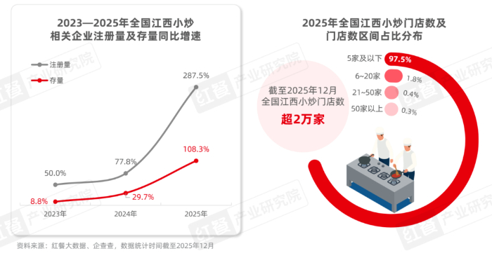 在门店规模方面,据红餐大数据,截至2025年12月,全国江西小炒门店总数已超过2万家。然而,从连锁化程度上看,江西小炒仍以中小体量门店为主,门店数在5家及以下的江西小炒品牌门店数占比高达97.5%,连锁化程度仍有较大提升空间。