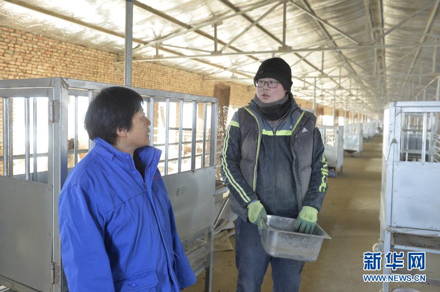 寇启芳(左)在宁夏吴忠市红寺堡区红寺堡镇城东养殖园区内向科研人员了解试验进度(1月7日摄)。新华社记者 唐如峰 摄