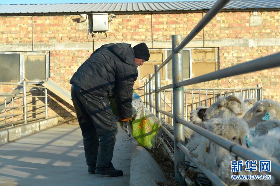 一名村民在宁夏吴忠市红寺堡区红寺堡镇城东养殖园区给滩羊投放饲料(1月7日摄)。新华社记者 唐如峰 摄