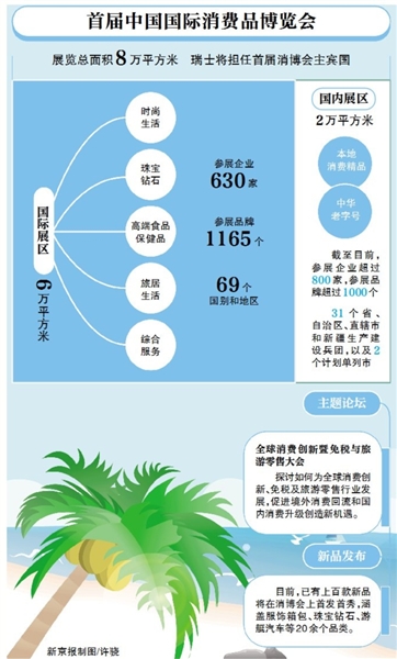首届中国国际消费品博览会将于5月7日至10日在海南省海口市举行。消博会分为国际、国内两个专区。国际展区分为时尚生活、珠宝钻石、高端食品保健品、旅居生活和综合服务五大专业展区,目前汇集了1165个国际品牌。在国内展区,全国各个地方正在组织消费精品和老字号参展,到目前为止,报名参展的品牌数也超过了1000个。