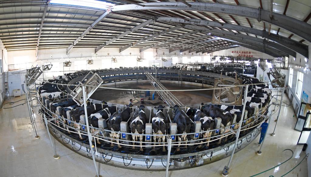 宁夏中卫市沐沙牧场的工作人员为自动转盘式奶台上的奶牛挤奶(2020年9月14日摄)。新华社记者 王鹏 摄
