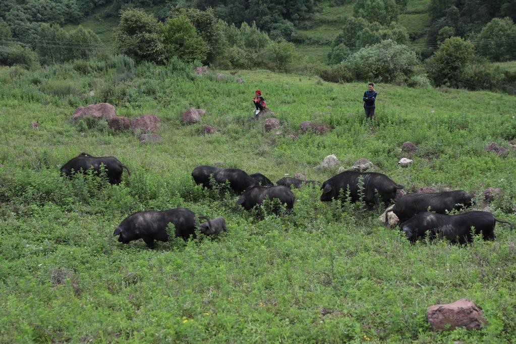四川省昭觉县,彝族青年郑吃合和妻子洛古有惹在山坡放养乌金猪(2020年7月22日摄)。新华社记者 江宏景 摄