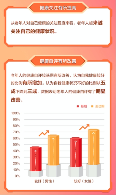 5. 提升老年人的健康认知能力,比如:1)提醒老人关注个体的健康,并积极进行健康自评(2)提高了老年人对老年病症如糖尿病的患病风险的认知。