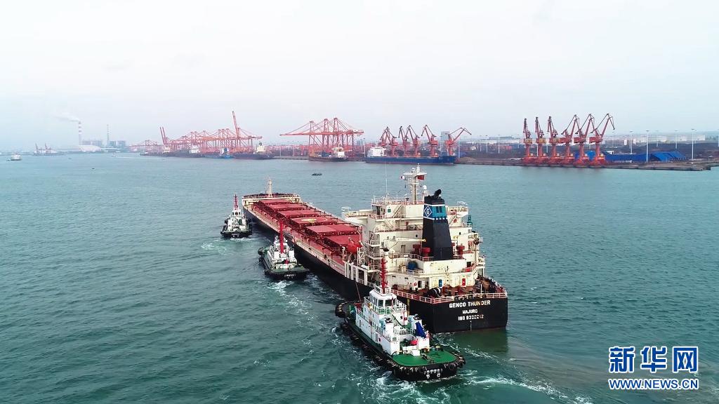 一艘10万吨级海轮在海事船的帮助下停靠广西钦州港码头卸货(无人机照片,5月12日摄)。新华社记者 张爱林 摄