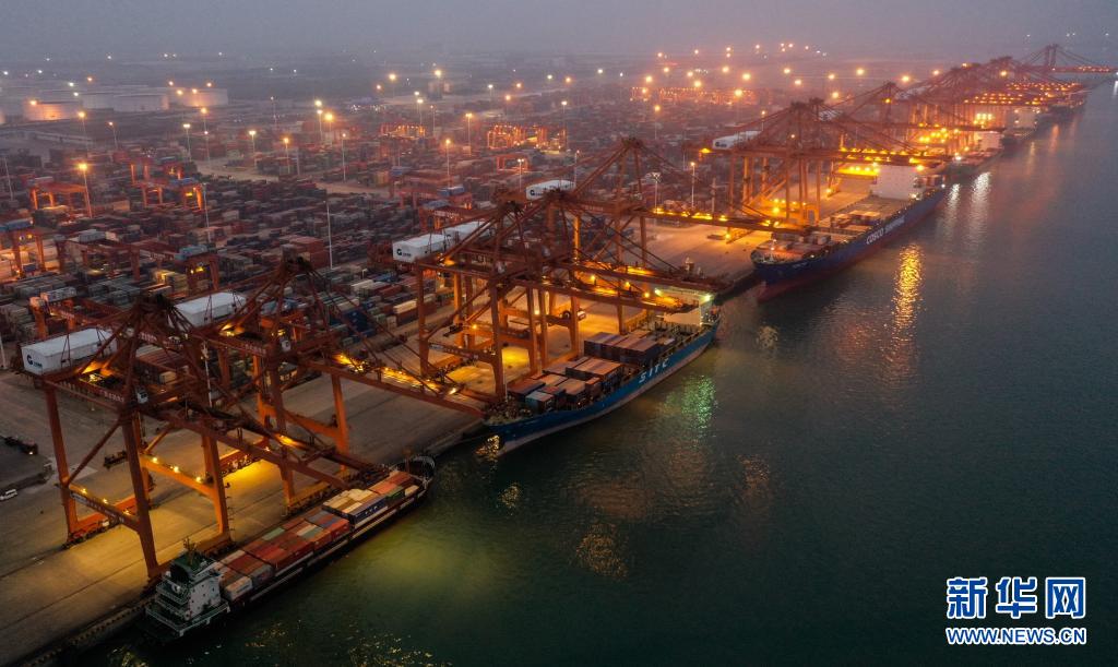 夜幕下的广西钦州港码头,海轮在装卸货物(无人机照片,3月24日摄)。新华社记者 张爱林 摄