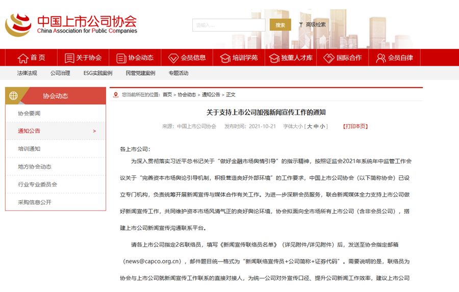 为进一步丰富上市公司新闻传播渠道,助力上市公司在全社会树立起良好的企业社会形象,协会在前期工作的基础上,建立上市公司新闻报道直报机制,常态化征集能够反映上市公司高质量发展的相关新闻素材,通过协会官网、公众号等媒体途径,积极展现上市公司非财务信息,努力营造全社会关心支持上市公司履行社会责任、实现高质量发展的良好舆论氛围。