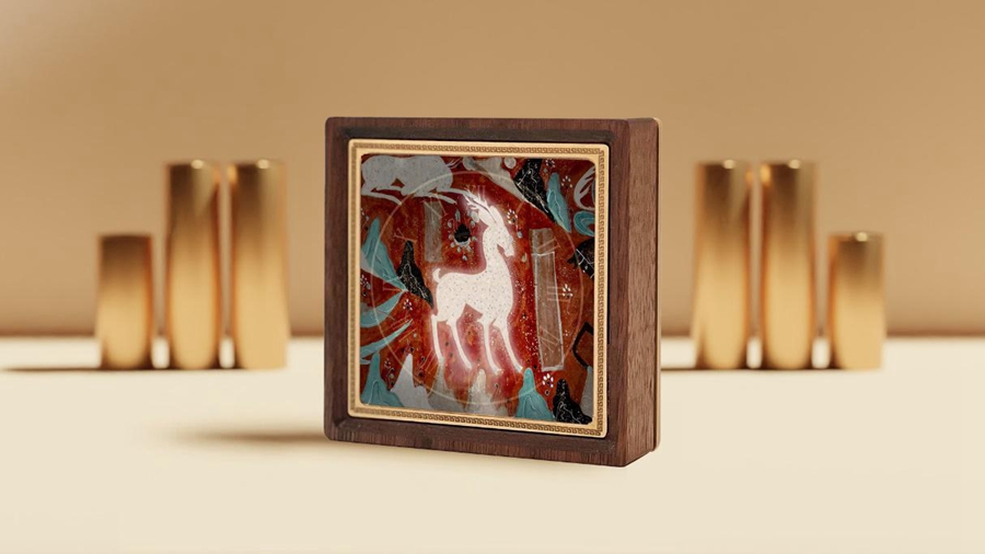 通过手机APP“数字猫”扫描产品实物,屏幕中便会开启一扇虚实穿梭的“任意门”,将人们从现实世界带到敦煌莫高窟257窟数字空间当中,仿佛穿越时空隧道来到千年之前。在这里,著名的敦煌壁画《鹿王本生图》会浮现而出,并在缓缓流动的数字光效的修复下,逐步呈现出原本光鲜靓丽的色泽。壁画中的九色鹿也如同获得新生,从动听的声音,到矫健的身影,这个神话故事中的经典形象仿佛近在眼前。