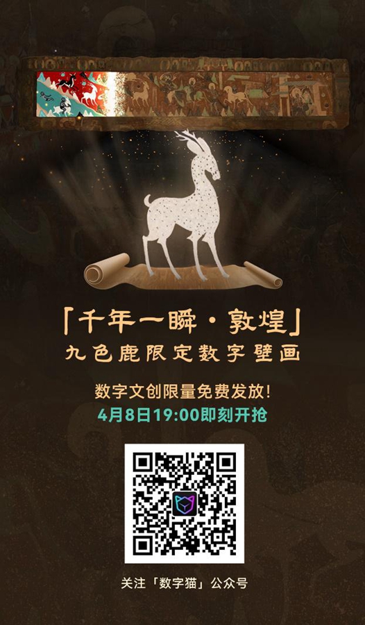 据介绍,《千年一瞬-敦煌九色鹿限定数字壁画》公测活动于4月8日19:00正式开启,关注“数字猫”微信公众号参与活动,即有机会获得先行体验名额,开启穿越千年的数字文创之旅。