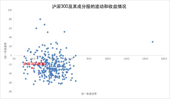 接着上面的例子,如果指数中一只权重占比1%的股票上涨了10%,那么仅会带动该指数上涨0.1%,指数基金的收益回报自然也比不上全部资金直接投资该个股的收益。但如果我们分析沪深300指数与其成份股在过往一年的波动率和收益率数据,可以发现沪深300指数的收益率虽然不及部分个股收益,但是波动率大幅降低了。投资指数的目标是获取目标市场的平均收益,讲求提高收益-风险性价比。如果单论收益率,自然是比不上涨幅最靠前的若干成份股。