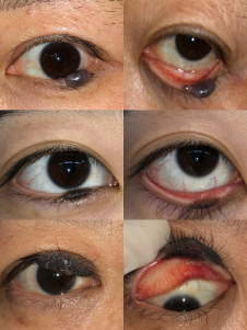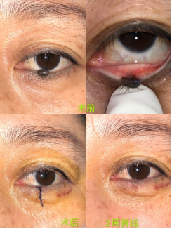 一般色素痣未累及睑缘和灰线,切除和修复相对容易,仅仅涉及前层眼睑缺损的再造和修复,如果越过灰线,累及眼睑内侧的睑板和睑结膜,就要涉及眼睑的全层切除,眼睑全层缺损的再造和修复,就会比较复杂,因为眼睑的前层和后层都需要重建和再造,术后外观和好眼比较,还是差距比较大的。另外,睫毛也会和色素痣一起切除,色素痣范围面积大的话,就会造成眼睑睫毛的缺失,年轻女性或者爱美的人士就会涉及术后戴假睫毛或者睫毛种植。(图3)