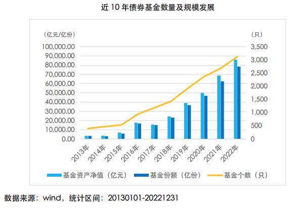 近年来,我国债券基金发展迅速,截至2022年底,债券基金数量突破3100只(不同份额合并统计),份额数超7.8万亿份,资产规模接近8.6万亿元,约占整个公募基金市场规模的三分之一。