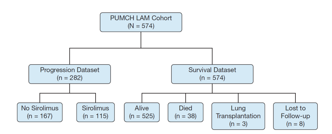 淋巴管肌瘤病(LAM)是一种几乎仅见于女性的、以进展性弥漫性肺部囊性病变为特征的罕见病,被列入我国首批罕见病目录,该病的10年生存率约为85%。近年来,LAM有了第一个有效治疗药物-雷帕霉素,血液血管内皮生长因子D(VEGF-D)成为LAM的诊断指标。徐凯峰教授带领的多学科团队对LAM临床队列进行了长期的追踪观察和研究。本研究从协和LAM队列(PUMC cohort)中提取了2组数据,包括进展队列数据282例和生存队列数据574例。