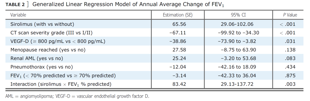 对疾病进展队列采用广义线性模型分析,发现了与疾病进展指标FEV1改变密切相关的3个关键因素为雷帕霉素治疗、CT分级和VEGF-D(见下表)。其他因素,如绝经状态、肾血管肌脂瘤、气胸史与基线FEV1变化无显著相关。