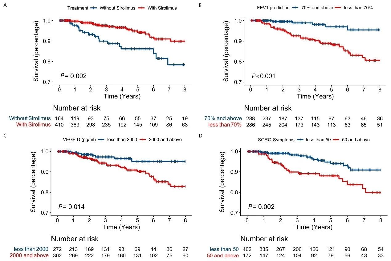 本研究最主要的发现:一是血清VEGF-D作为LAM的生物标记物,与疾病进展和生存预后相关;二是雷帕霉素作为LAM的治疗药物,不仅有效延缓了疾病进展,也显著改善了LAM患者的生存预后。