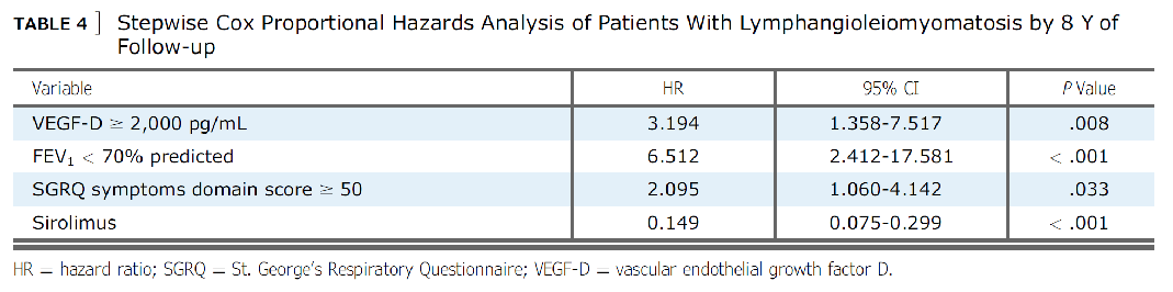 Cox比例风险回归模型分析显示,雷帕霉素治疗降低85.1%的死亡或肺移植风险;VEGF-D≥2000pg/mL较2000pg/mL以下相比,死亡或肺移植风险增加2.194倍;基线FEV1低于70%预计值与≥70%预计值相比,死亡或肺移植风险增加5.512倍(见下表)。进一步采用逆概率加权分析,雷帕霉素治疗后死亡风险降低85.6%。